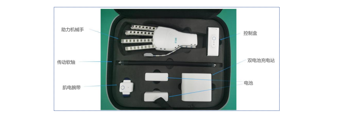 故,本产品实现了如下功能:①评估功能,可评估患者的手指屈肌肌力信号与伸肌肌力信号(sEMG),反映患者的手功能康复程度。②训练功能,根据使用需求选择省力模式、灵巧模式或律动模式来进行作业训练。③查询信息功能,可查询患者的评估数据和训练信息,方便医师和患者了解目前康复状态。
